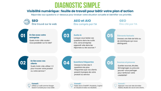 Avant de multiplier les contenus, il est utile de télécharger le fichier intitulé « Feuille de travail pour bâtir votre plan d’action », qui vous permet de répondre à des questions pertinentes afin de mieux établir votre diagnostic.